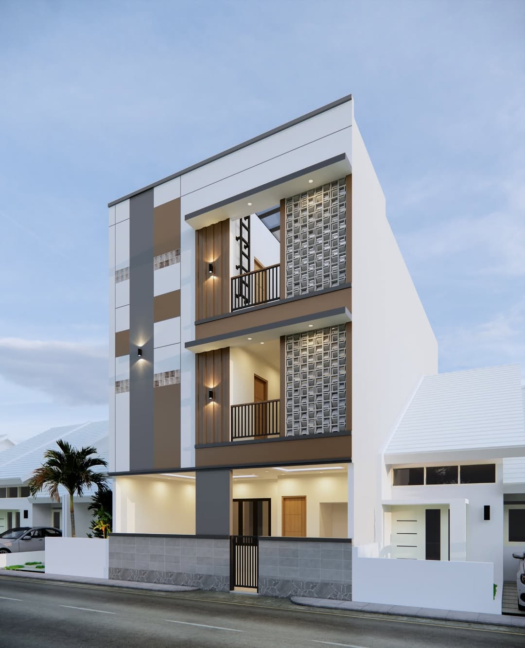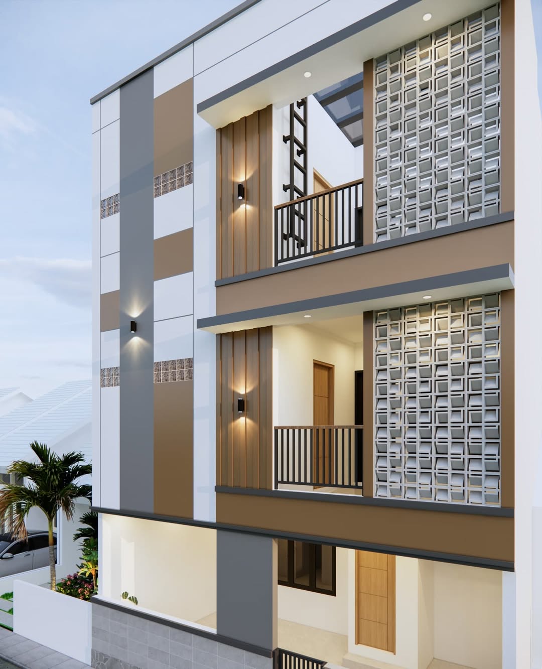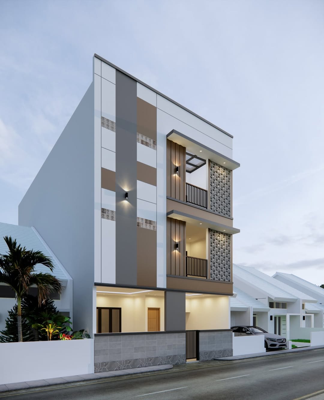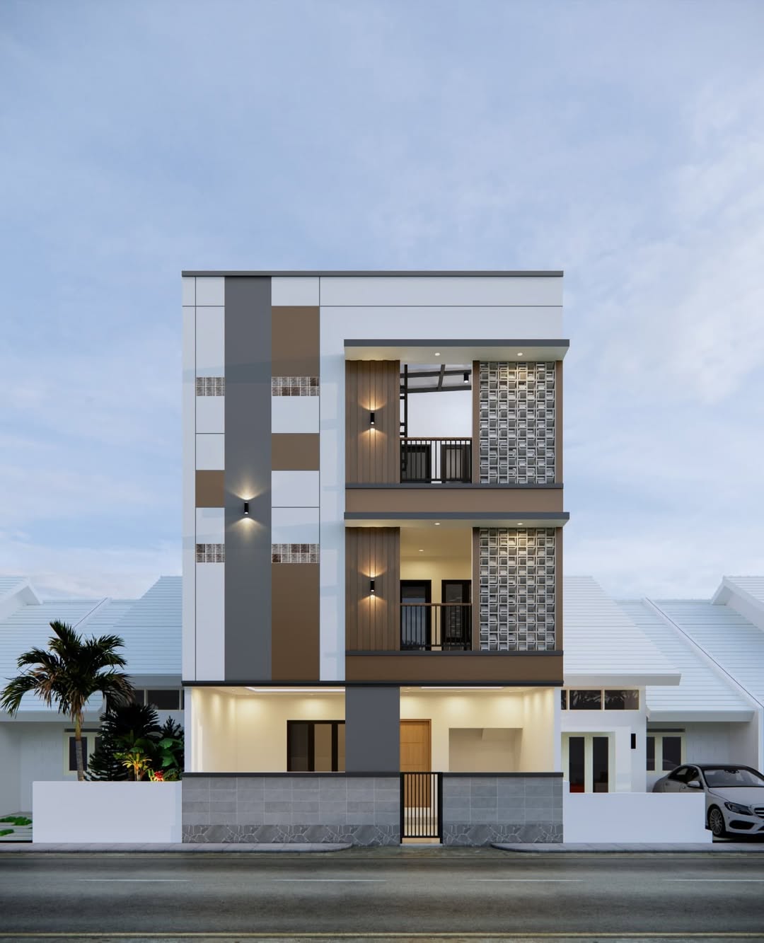 Desain Rumah Kost 3 Lantai dengan Kombinasi Warna Cokelat dan Putih